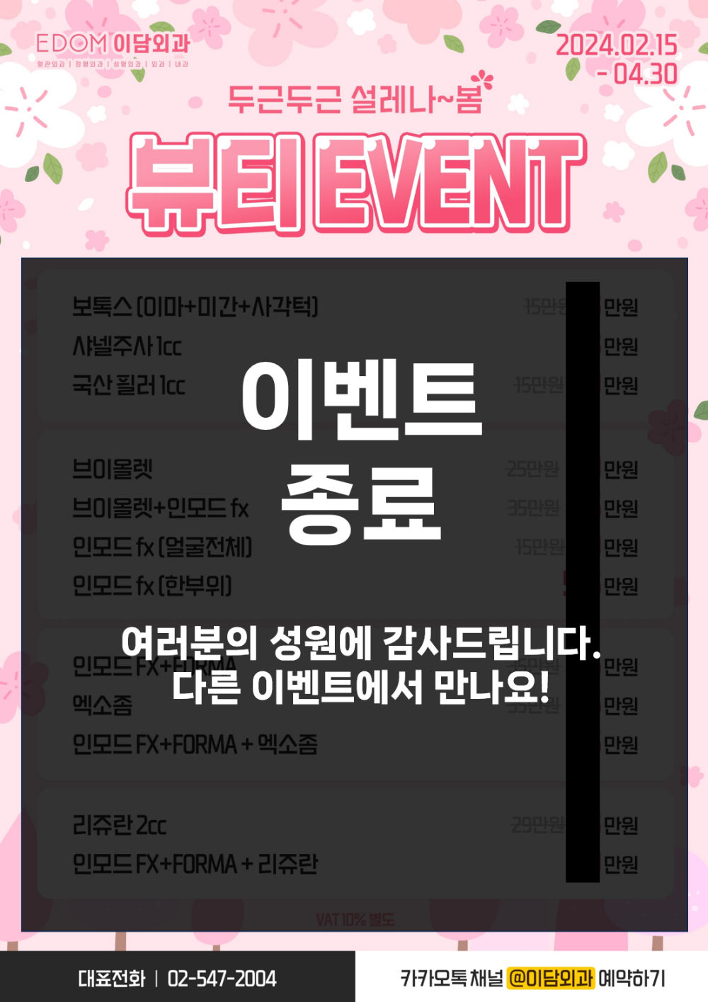 [성형피부센터] 두근두근 설레나~ 봄! 뷰티 이벤트 (종료) 대표전화 02-547-2004 또는 카카오톡채널 '이담외과의원'에서 진료예약 가능합니다. 2024년 이담외과 탁상달력 출시 및 환자 제공 (종료) 2024년 청룡의 해를 맞이하여 '이담달력'이 출시되었습니다. 탁상달력이 필요하신 분은 진료 후에 '원무과'에서 달력 … 이전페이지 없음1현재페이지2다음페이지