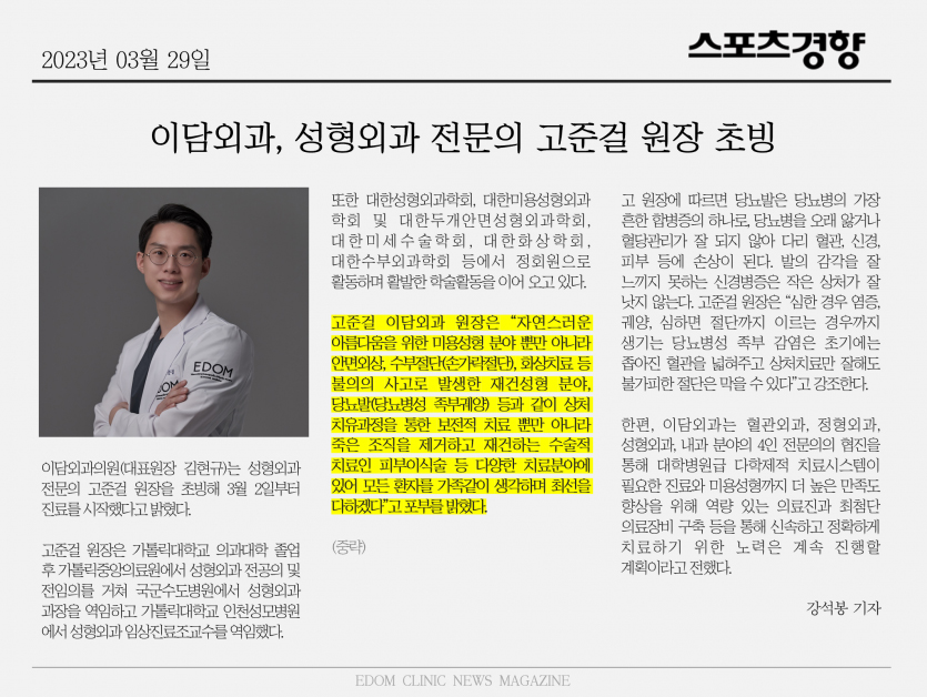 이담외과, 성형외과 전문의 고준걸 원장 초빙