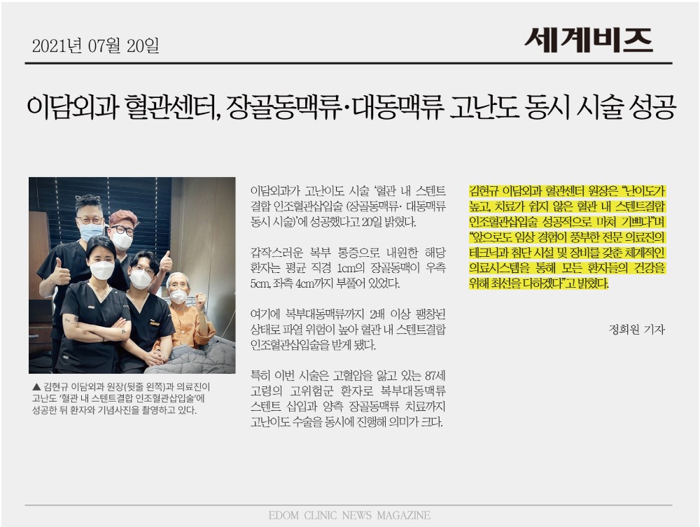 이담외과 혈관센터, 장골동맥류·대동맥류 고난도 동시 시술 성공