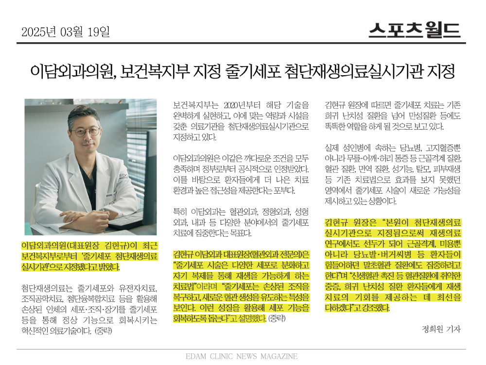 이담외과의원, 보건복지부 지정 줄기세포 첨단재생의료실시기관 지정