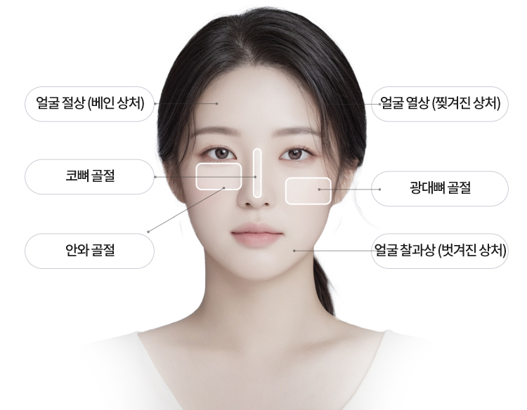 얼굴 외상 치료는 얼굴에 생긴 여러 상처(찢어진 상처, 베인 상처, 벗겨진 상처)와 같이 작은상처부터 골절, 화상 등 큰 상처등이 생겼을때 치료를 말합니다. 얼굴 부위에 나는 상처이기 때문에 빠른 치료와 흉터는 최소로 줄이는 치료가 중요하며 얼굴외상의 종류는 다양한만큼 그 종류에 맞춘 치료로 진행이 되어야합니다.